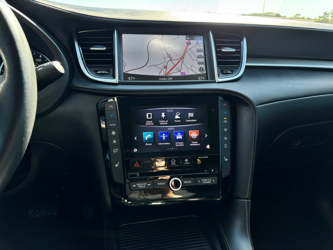 - Radio: AM/FM/CD Audio System -inc: 6-speaker w/4 USBs, INFINITI InTouch navigation w/upper 8" and lower 7" VGA LCD touch screens, INFINITI voice recognition for navigation, INFINITI InTouch services select w/4 year complimentary trial access to convenience services, INFINITI InTouch services premier w/12 month complimentary trial access to safety, security and convenience services, SiriusXM Traffic w/4-year complimentary trial access to real-time traffic information and SiriusXM Travel Link w/4-year complimentary trial access to weather, fuel prices, stocks, sports and movie times